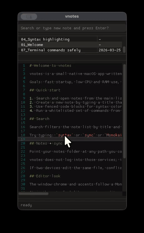 I’ve been shipping vnotes (velocity notes) with a very specific taste in mind: the clarity of Sublime, the speed and “type-to-find” rhythm of nvALT, and one habit I couldn’t give up from IntelliJ—running a command from the document with a shortcut, then seeing the result right there.