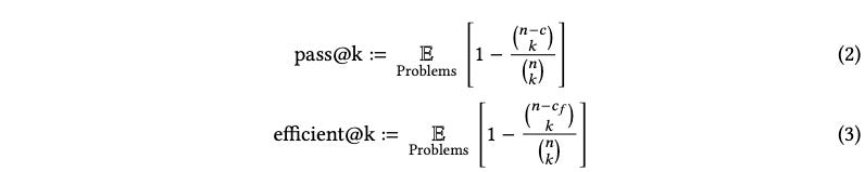 Note: efficient@k (2) idea derives from pass@k (1) - it evaluates the probability of LLMs to generate correct and fast enough code solutions by comparing the CPU instruction count with ground truth solutions.